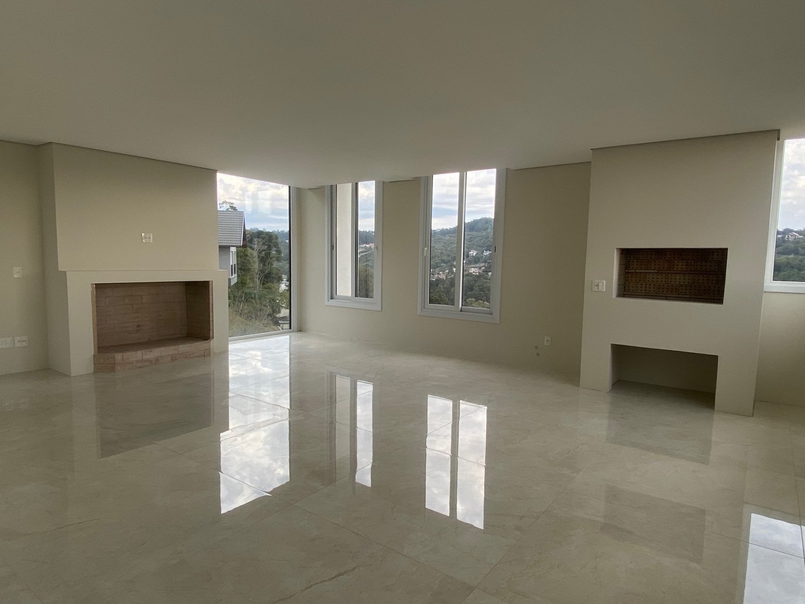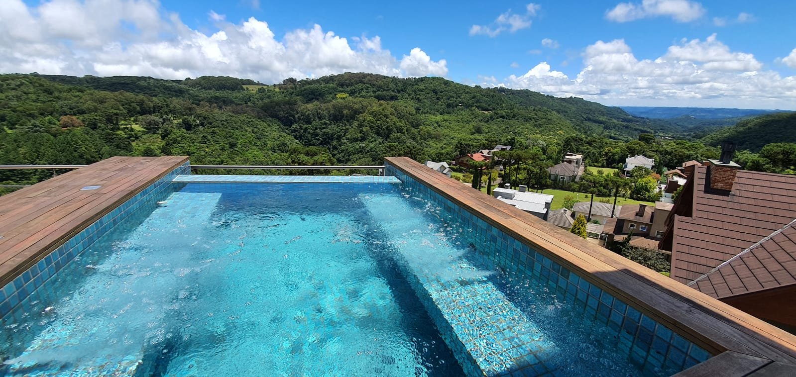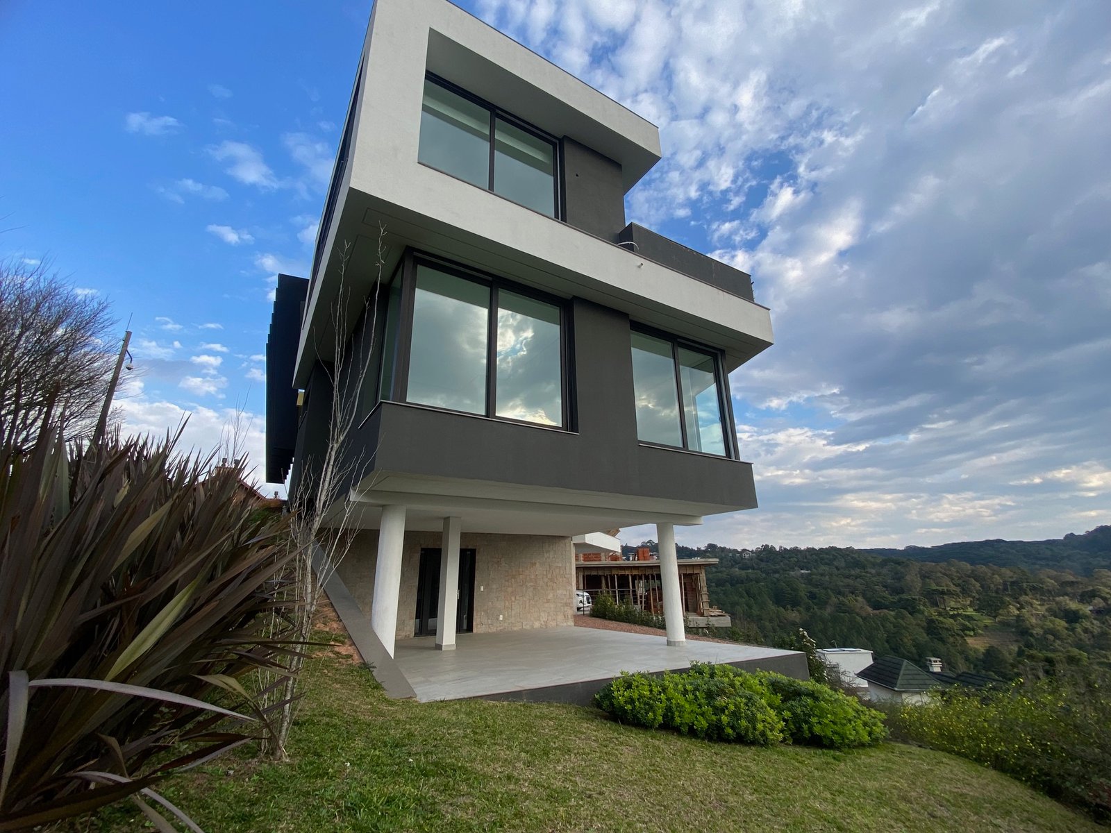 DETALHES CONSTRUTIVOS: Esquadrias pretas SCHEIN com vidro duplo, porcelanato PORTOBELLO em todos os ambientes, teto rebaixado com gesso, esperas para calefação e ar condicionado em todos os ambientes. Elevador Thyssen Krupp instalado e piscina com hidromassagem, borda infinita e iluminação. Todos os ambientes com vista panorâmica para o vale.