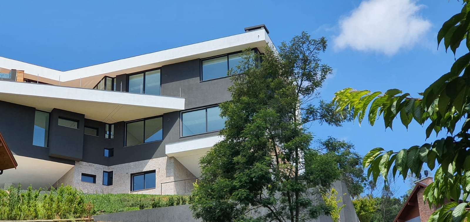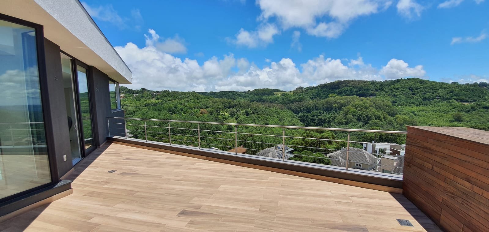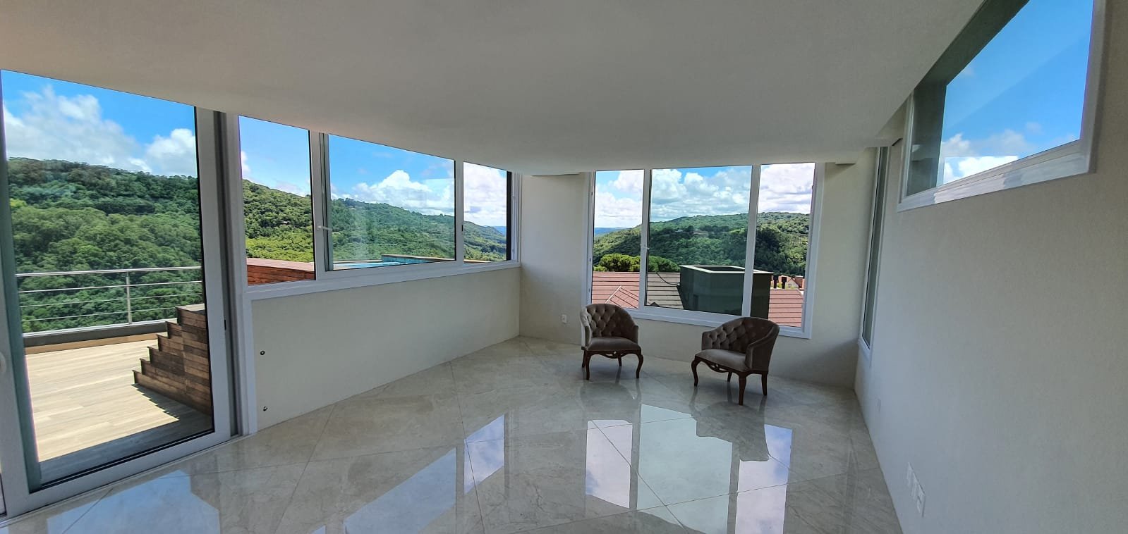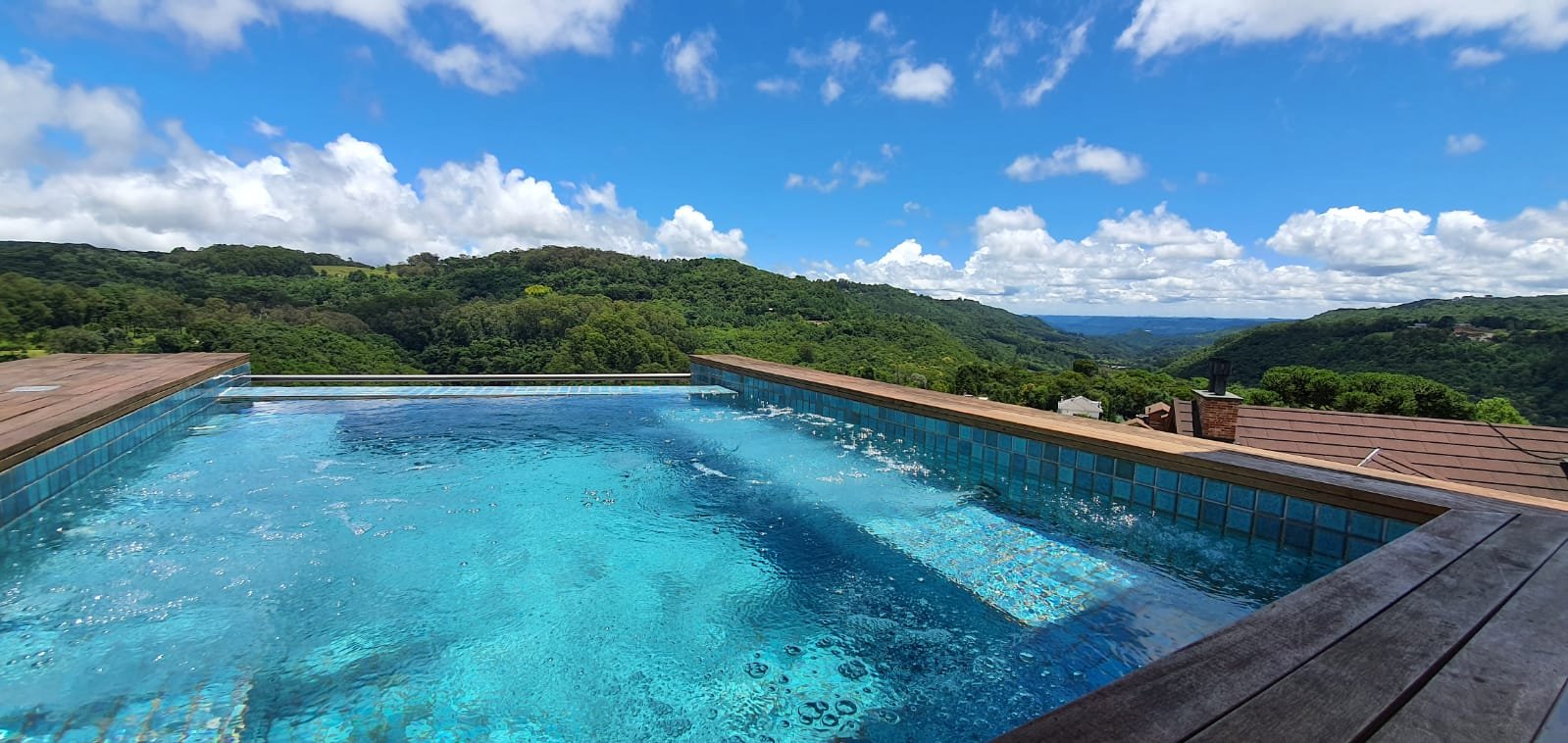 DETALHES CONSTRUTIVOS: Esquadrias pretas SCHEIN com vidro duplo, porcelanato PORTOBELLO em todos os ambientes, teto rebaixado com gesso, esperas para calefação e ar condicionado em todos os ambientes. Elevador Thyssen Krupp instalado e piscina com hidromassagem, borda infinita e iluminação. Todos os ambientes com vista panorâmica para o vale.
