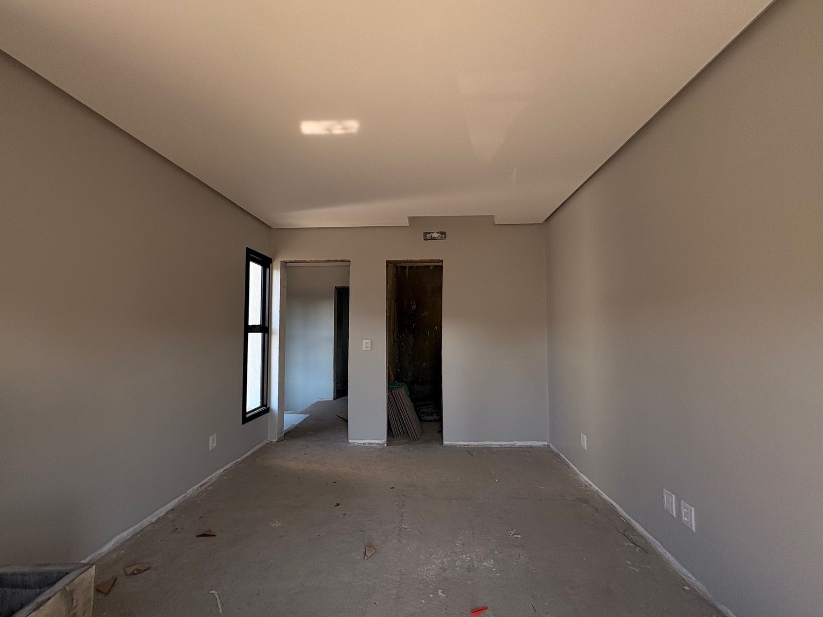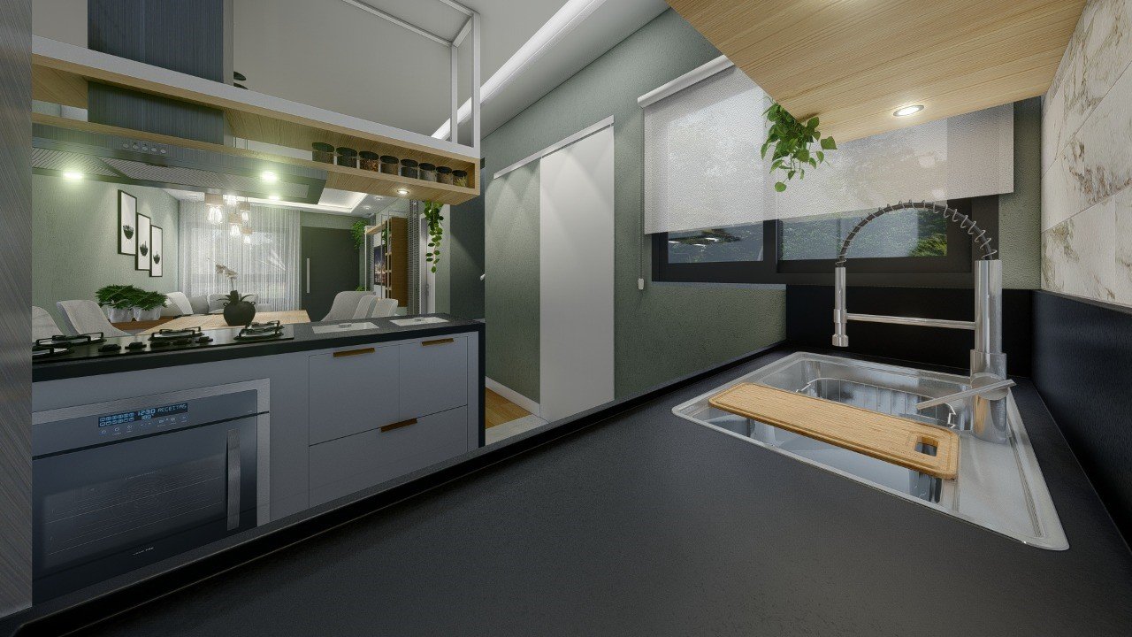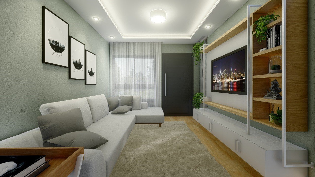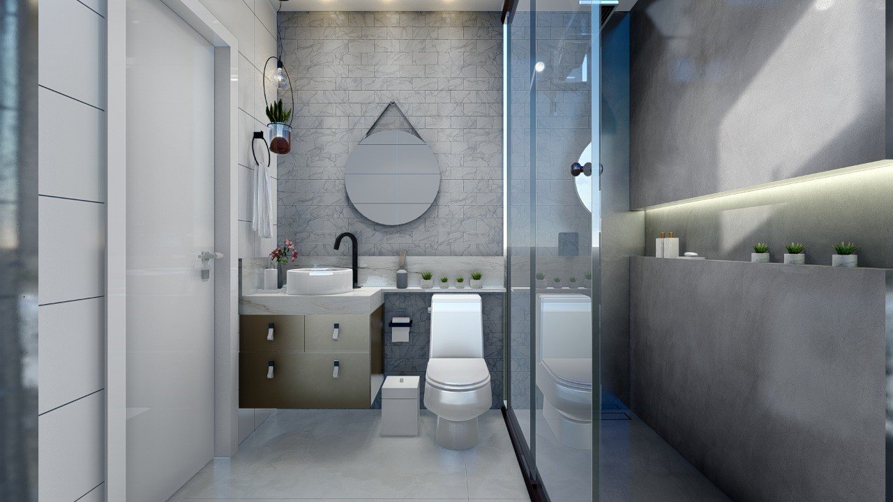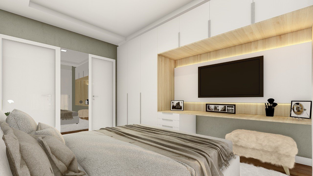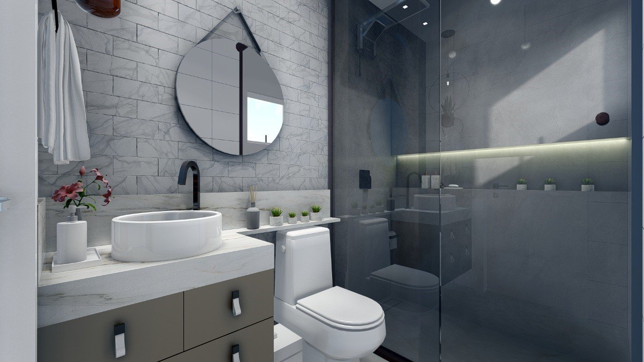 Acabamento em piso porcelanato, rebaixo em gesso esquadrias em alumínio, espera para água quente.
