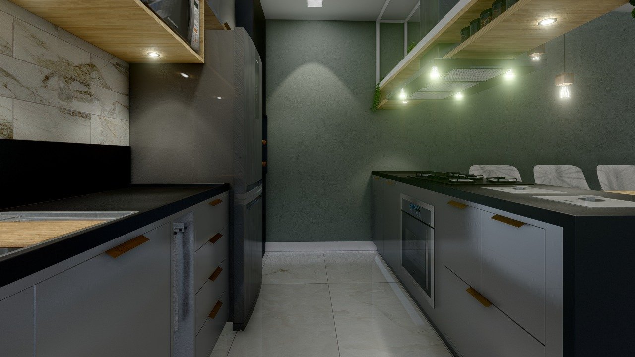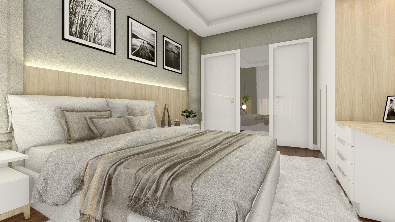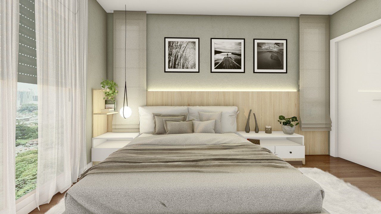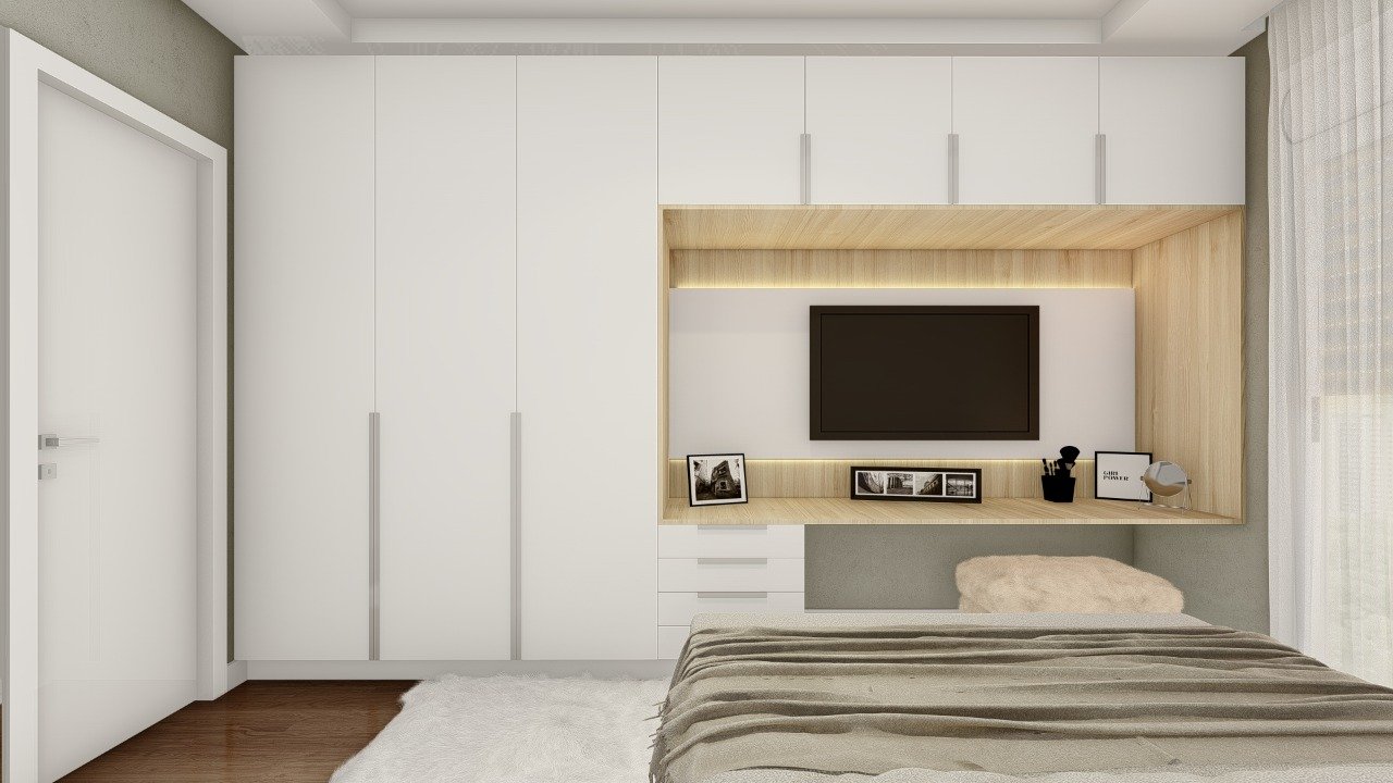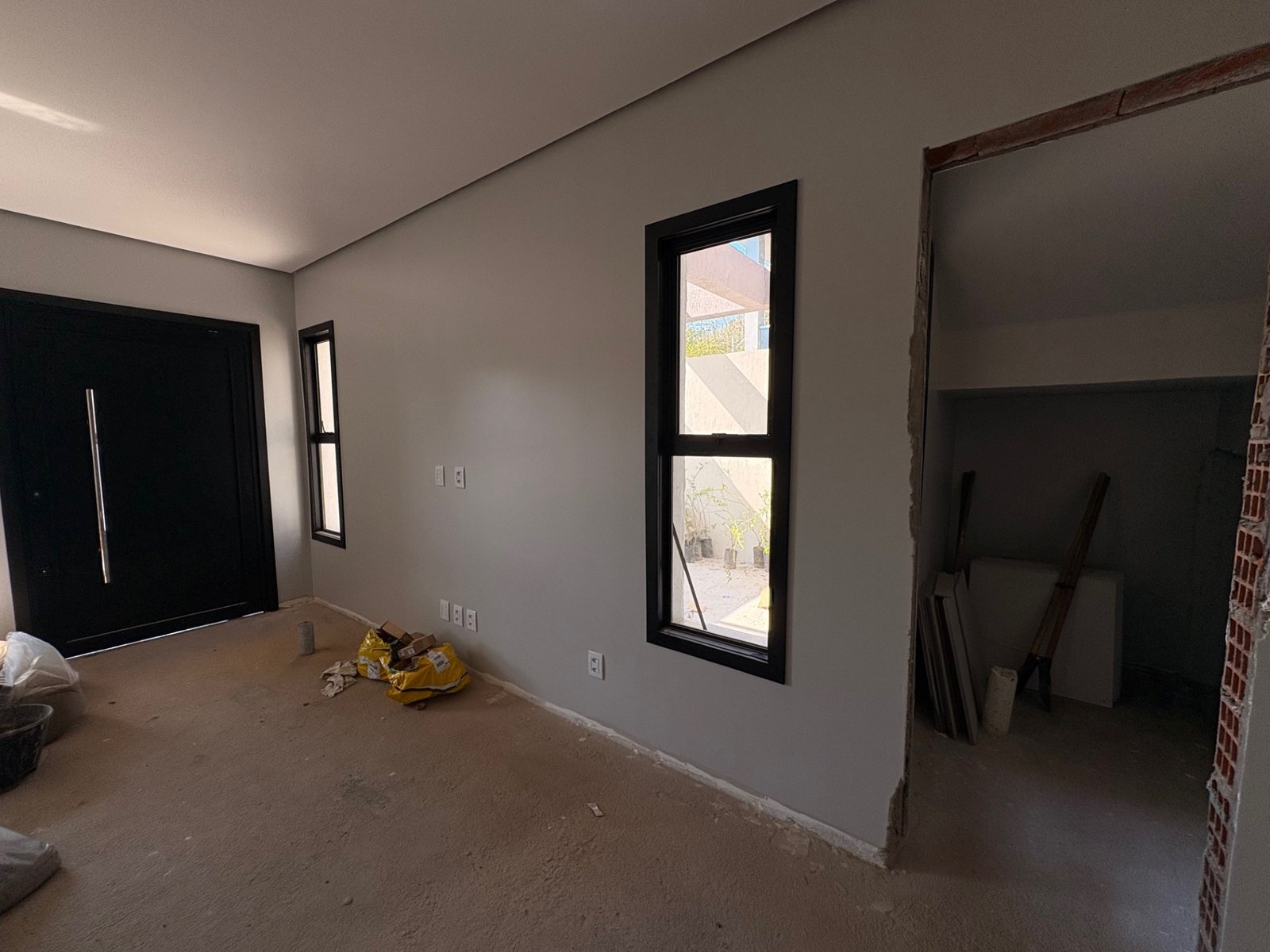 Acabamento em piso porcelanato, rebaixo em gesso esquadrias em alumínio, espera para água quente.