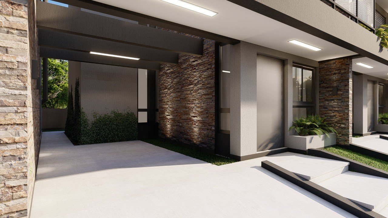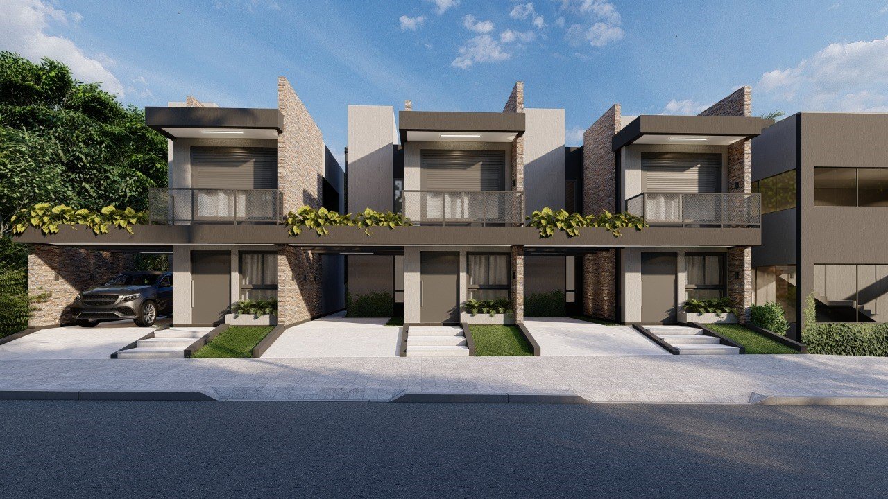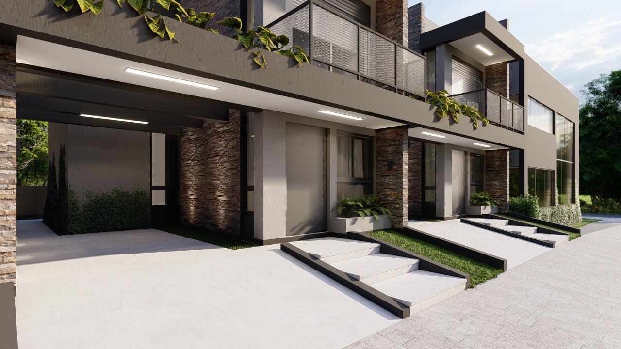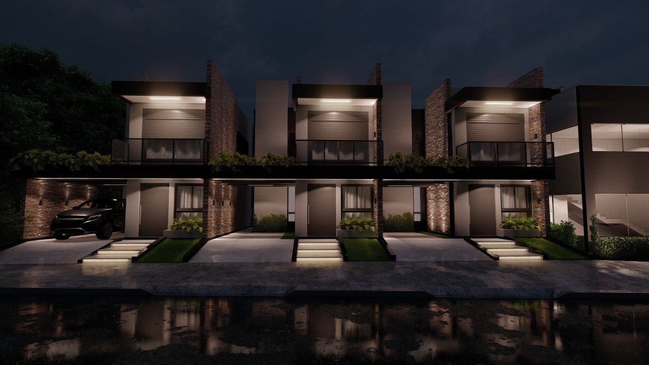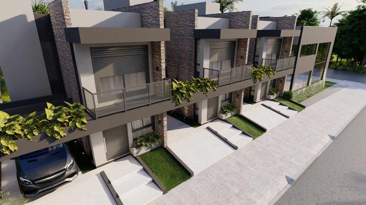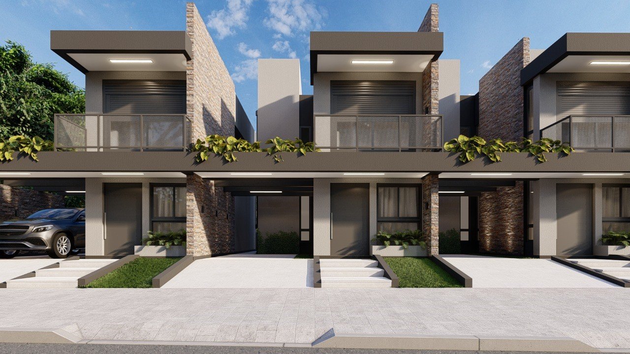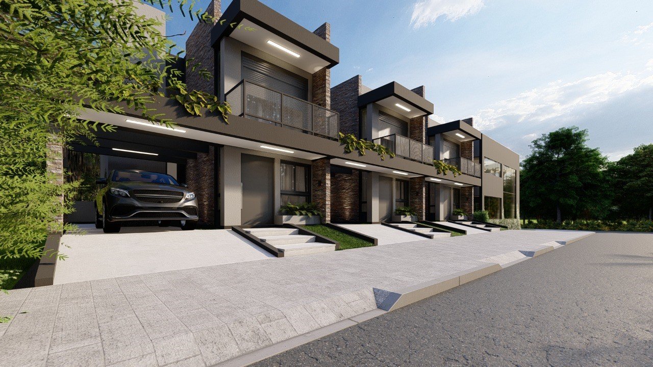 Projeto em construção no bairro Bom Jardim, 2 sobrados com 108 m² privativos, compostos por duas suítes no segundo pavimento, sala de estar, jantar e cozinha com churrasqueira integrados, área de serviço e despensa no térreo.