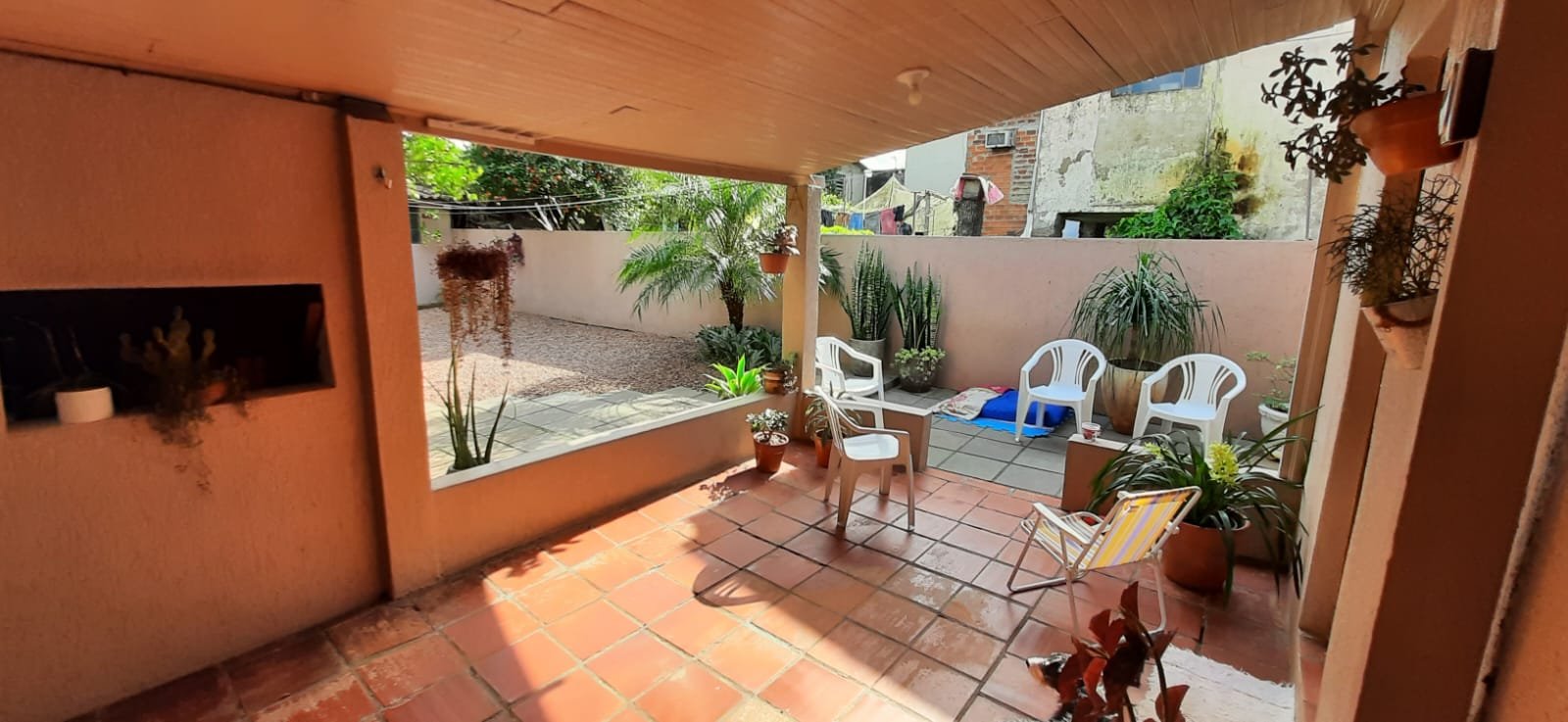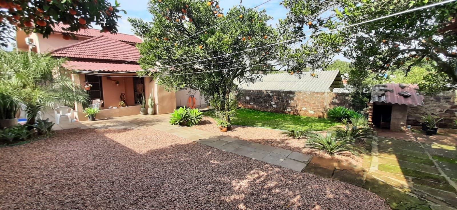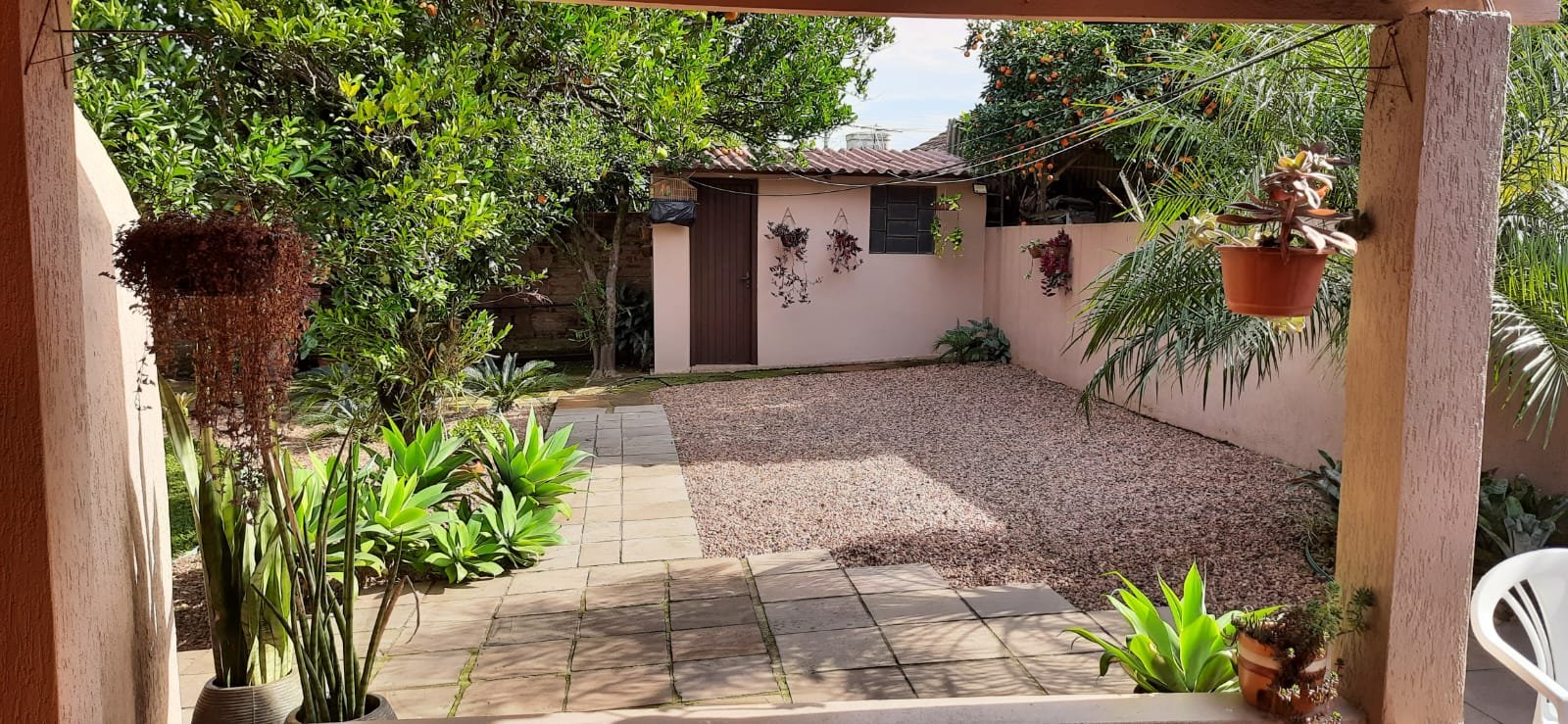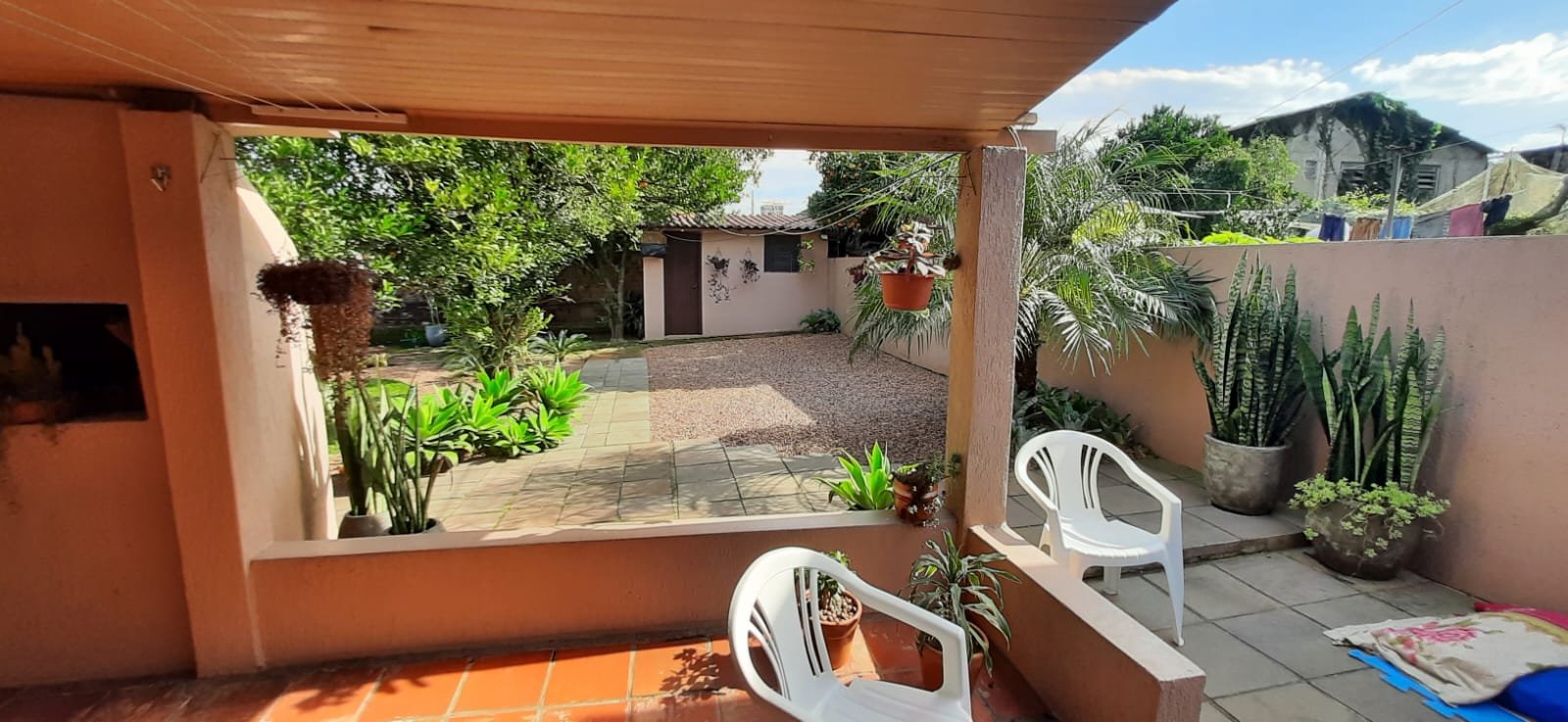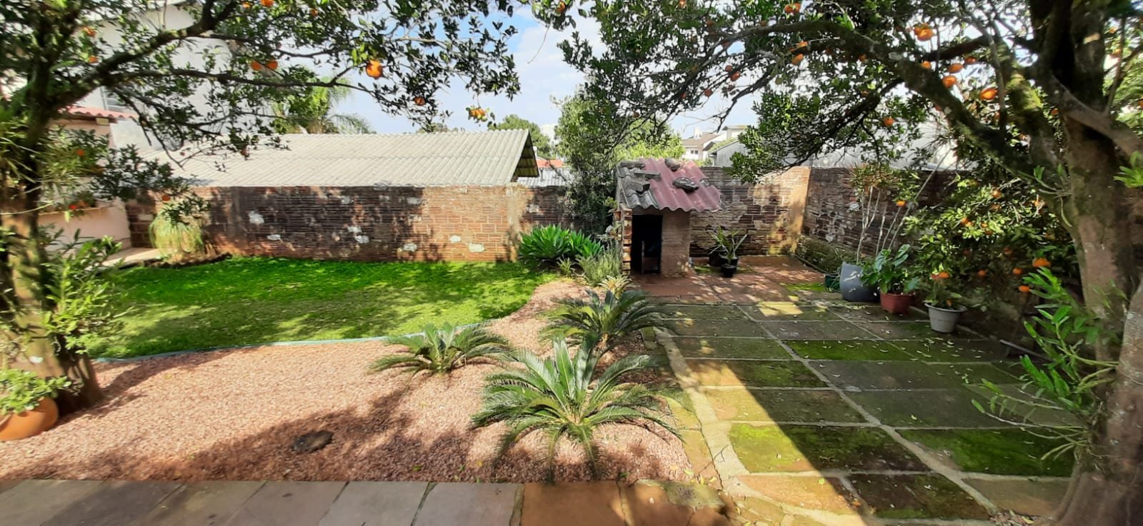 Pátio nos fundos com árvores e gramado.