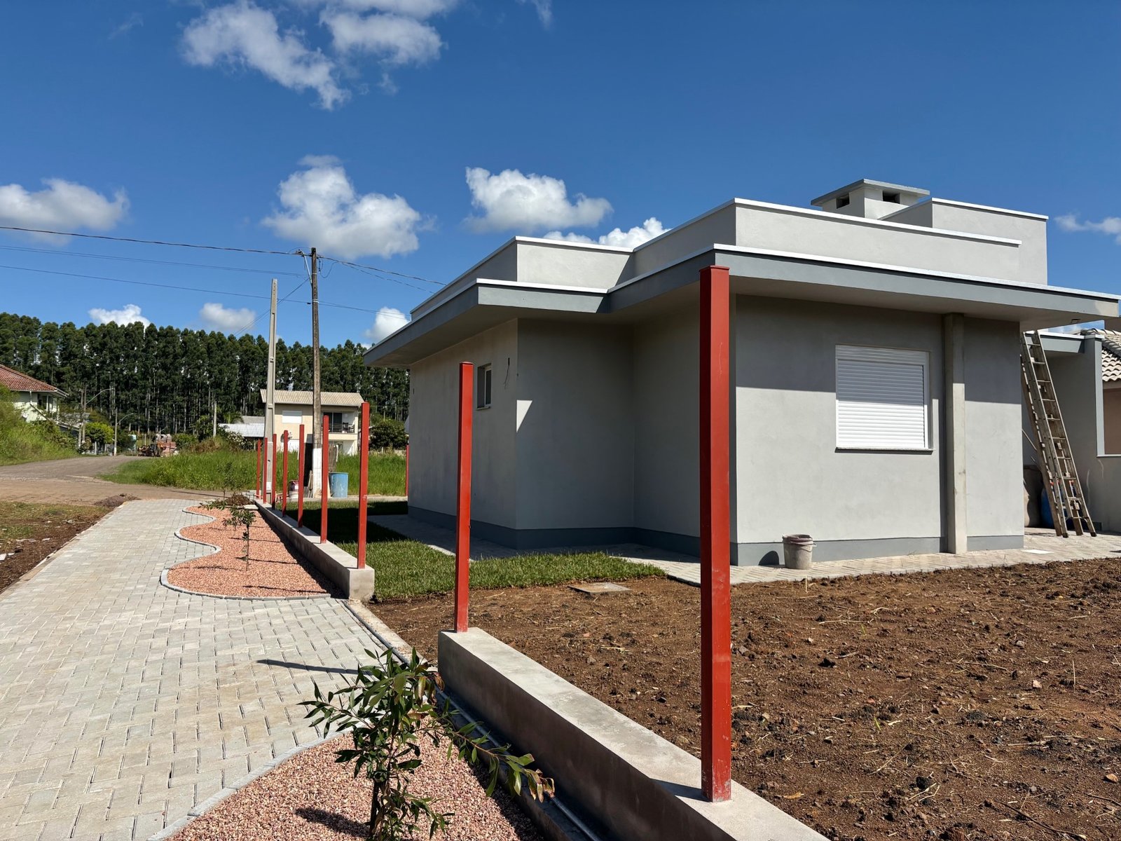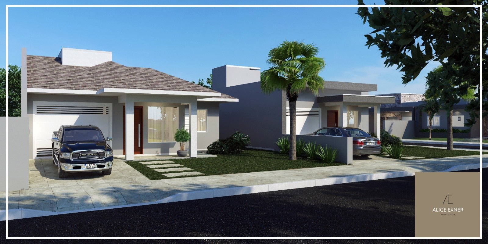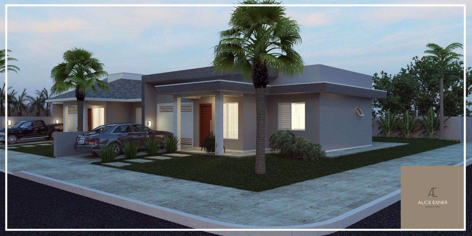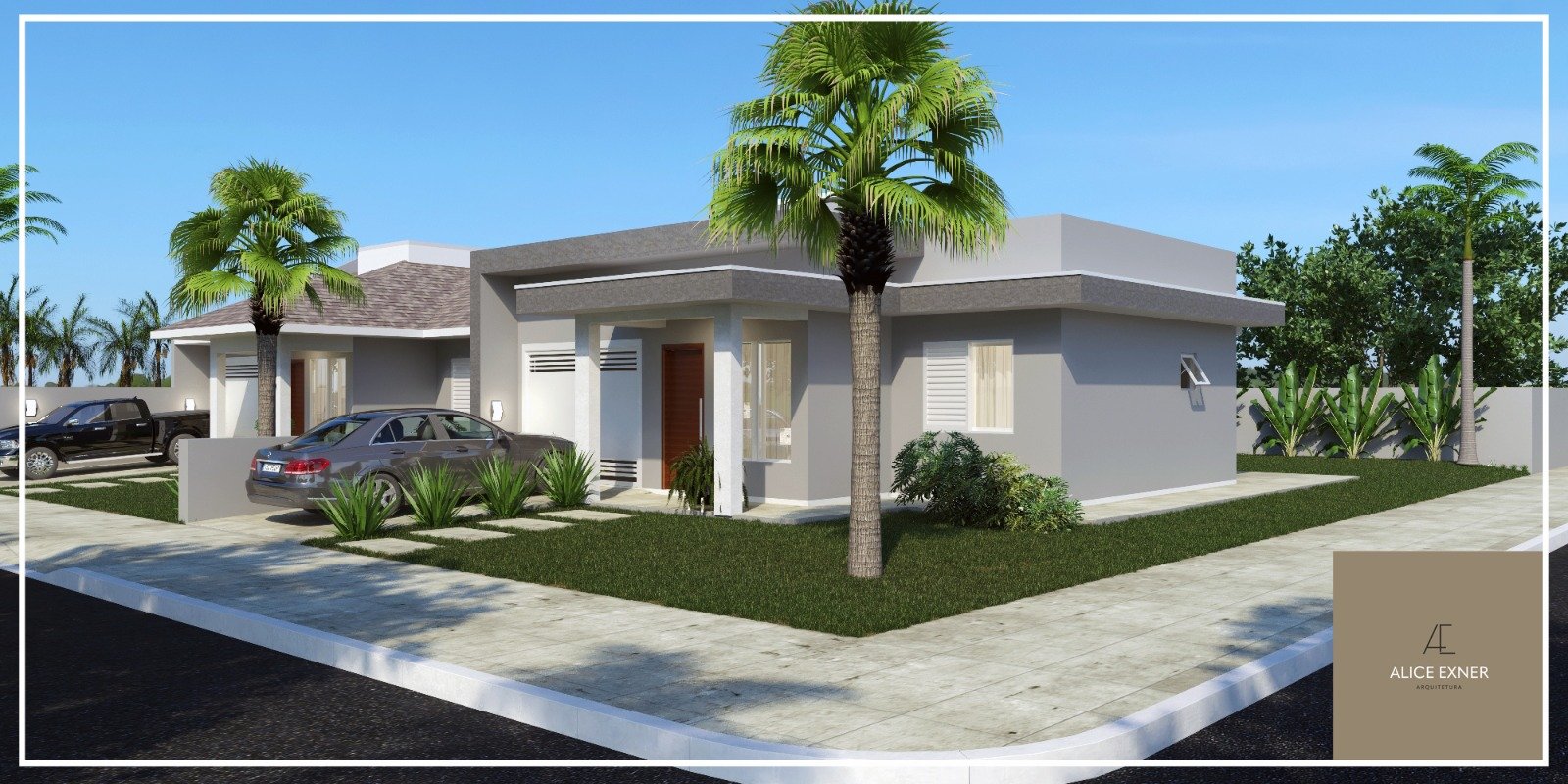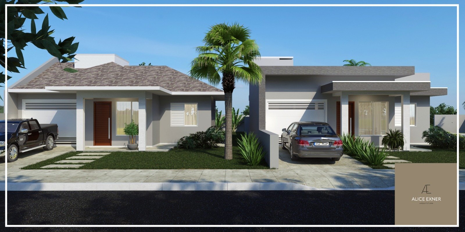 Casa em alvenaria de 85,37 m² de área construída cada, edificada em um terreno com 291 m² de área total, com 12 m de largura, por 24,25 m de comprimento.