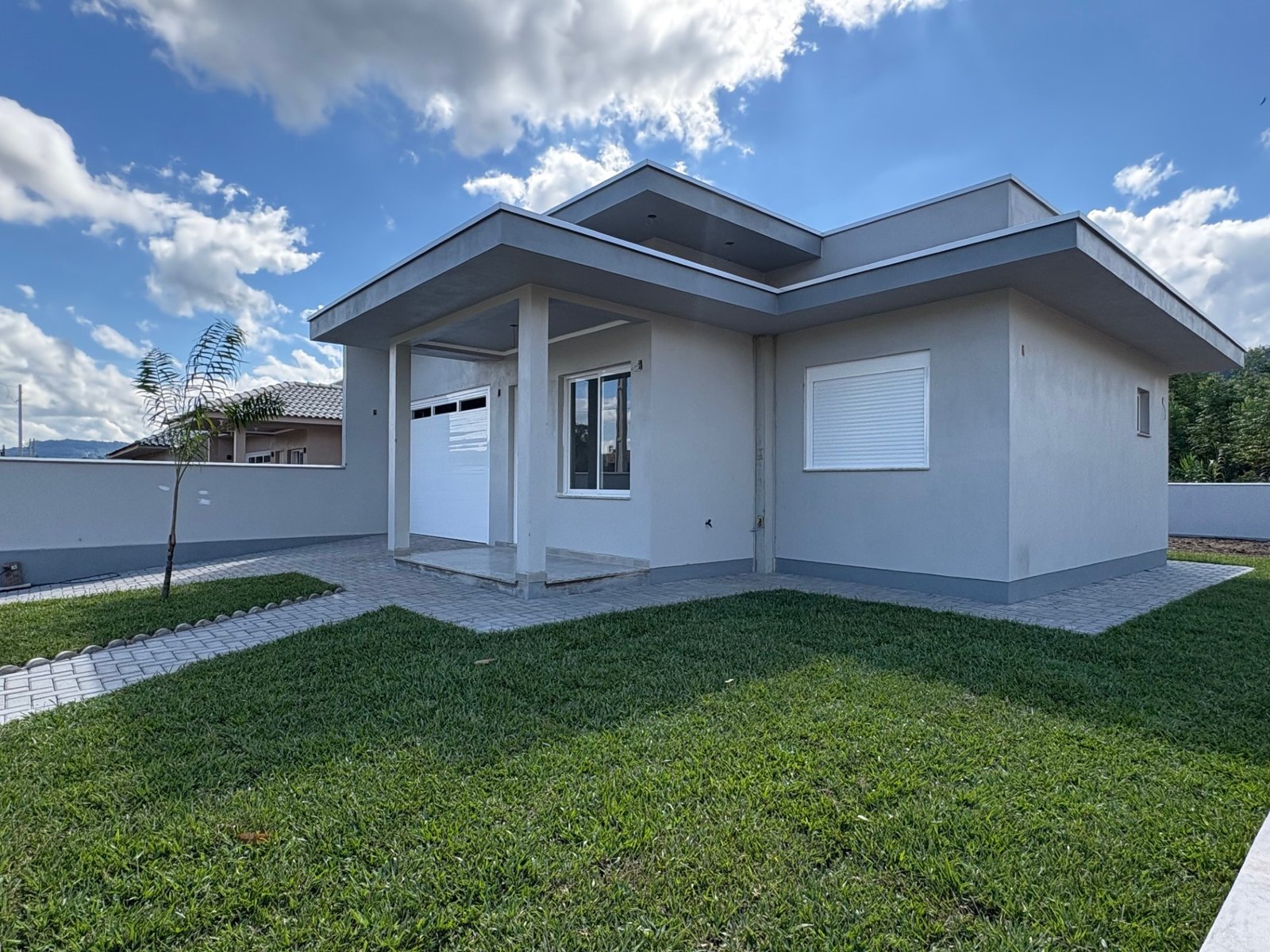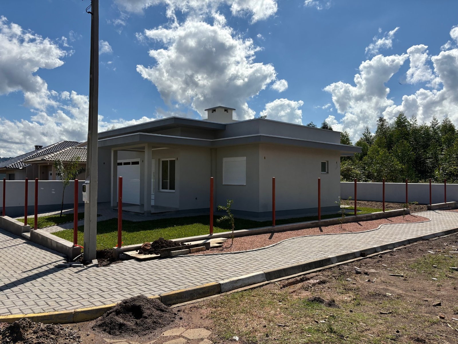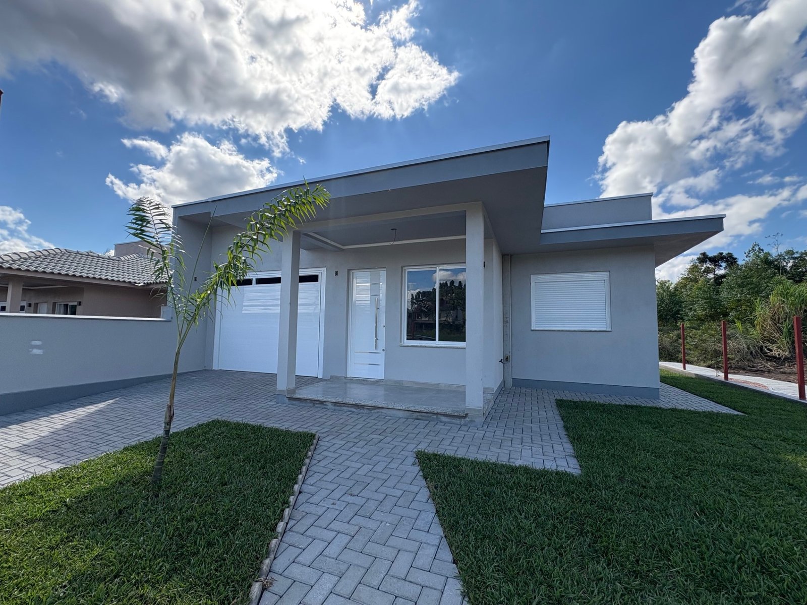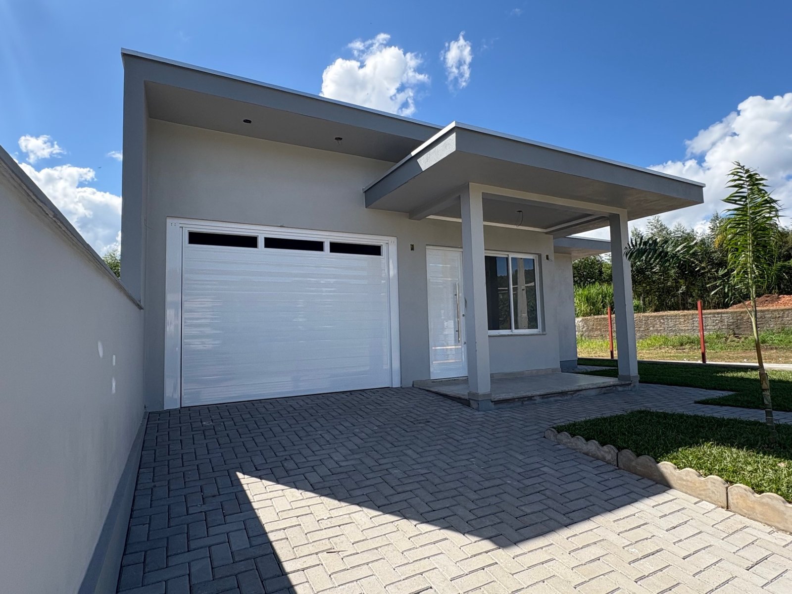 O imóvel é dividido em um ambiente com dois dormitórios, um banheiro, sala de estar, jantar e cozinha em ambientes integrados, área de serviço e garagem com churrasqueira e espaço para um automóvel.